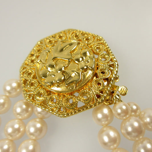 【中古】 フラワーモチーフ/3連パール ネックレス