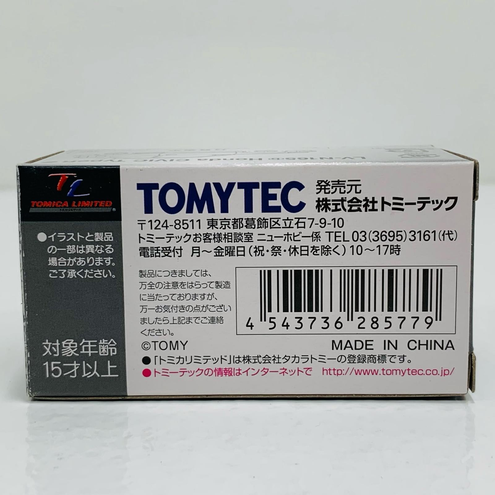 | 表記サイズ | ・型番:285779 ・本体重量:約54g ・幅:8cm ・高さ:4cm ・奥行:4cm ・スケール:'1/64 ・作品名:トミカ ・キャラクター名:1/64 LV-N165b ホンダ シビックタイプR 99年(ブラック) | ||