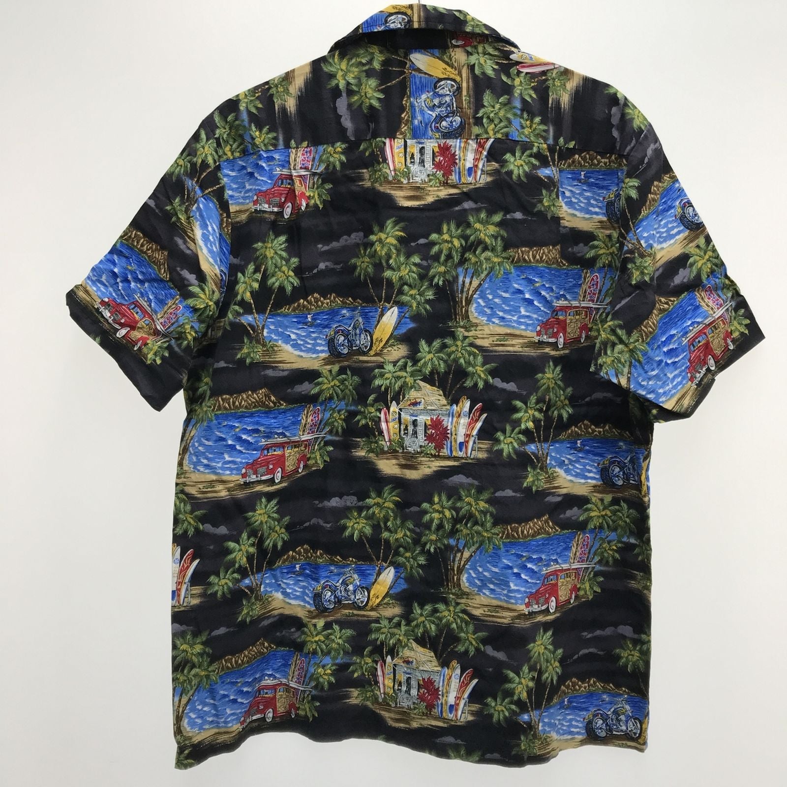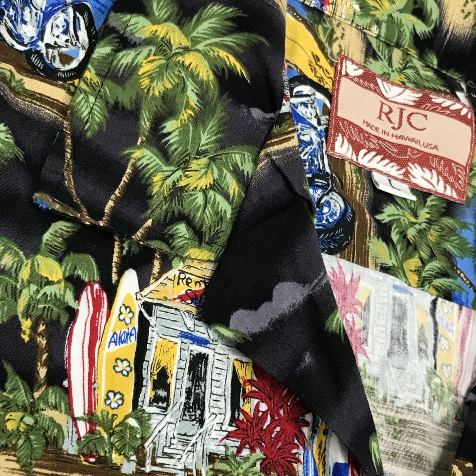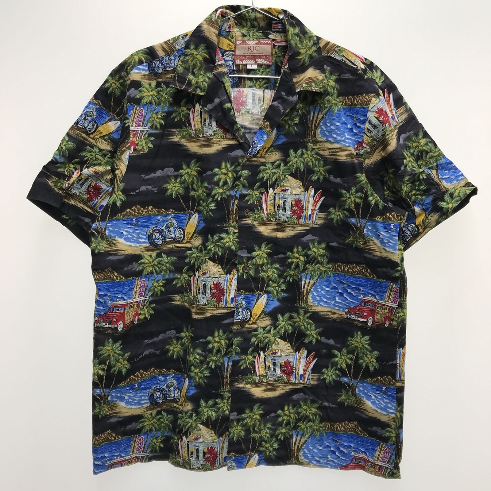 【中古】RJC | アールジェイシー 半袖シャツ 80~90年代 RJC アロハ ハワイアンシャツ ブラック オートバイ柄 ブラック サイズ:L【加古川物流】