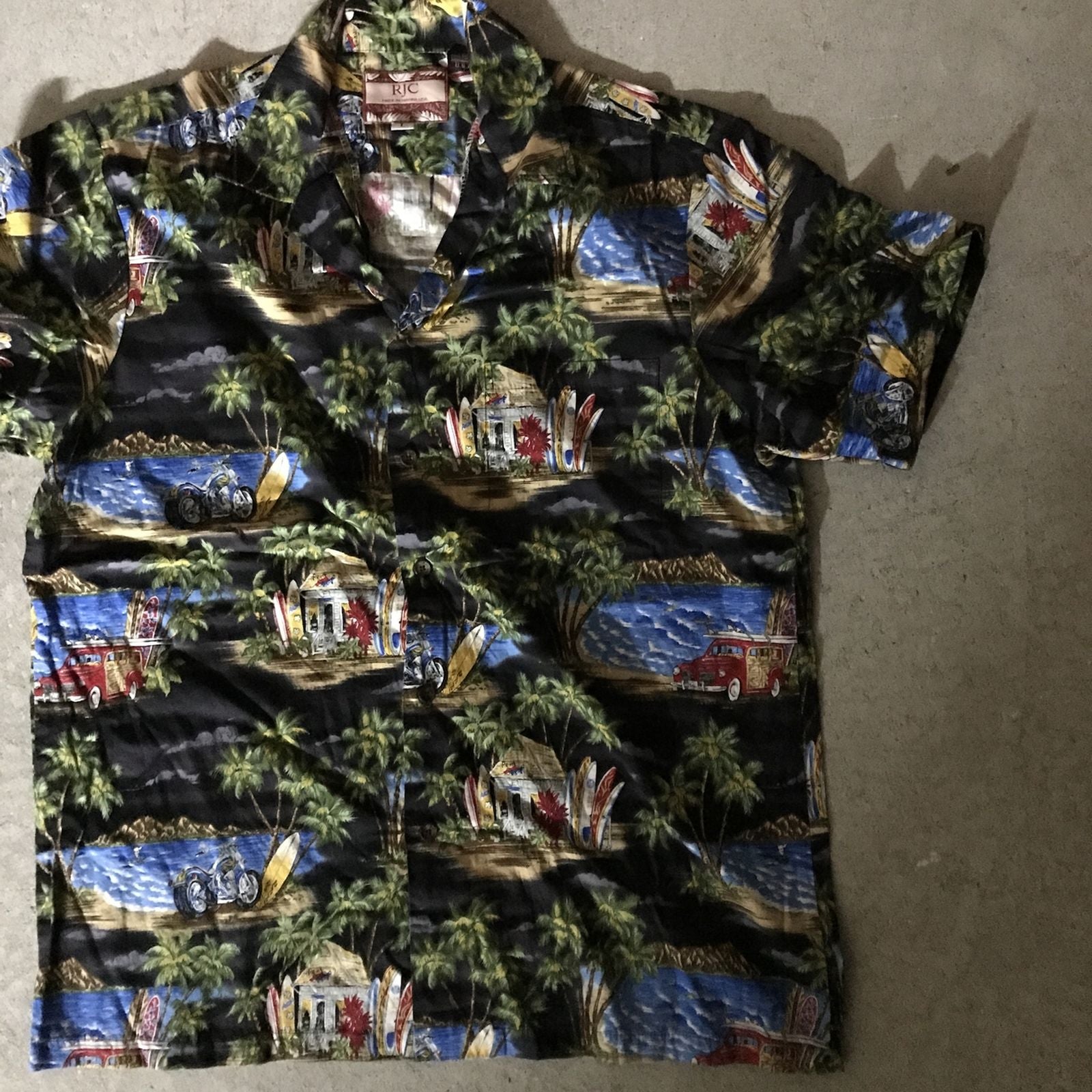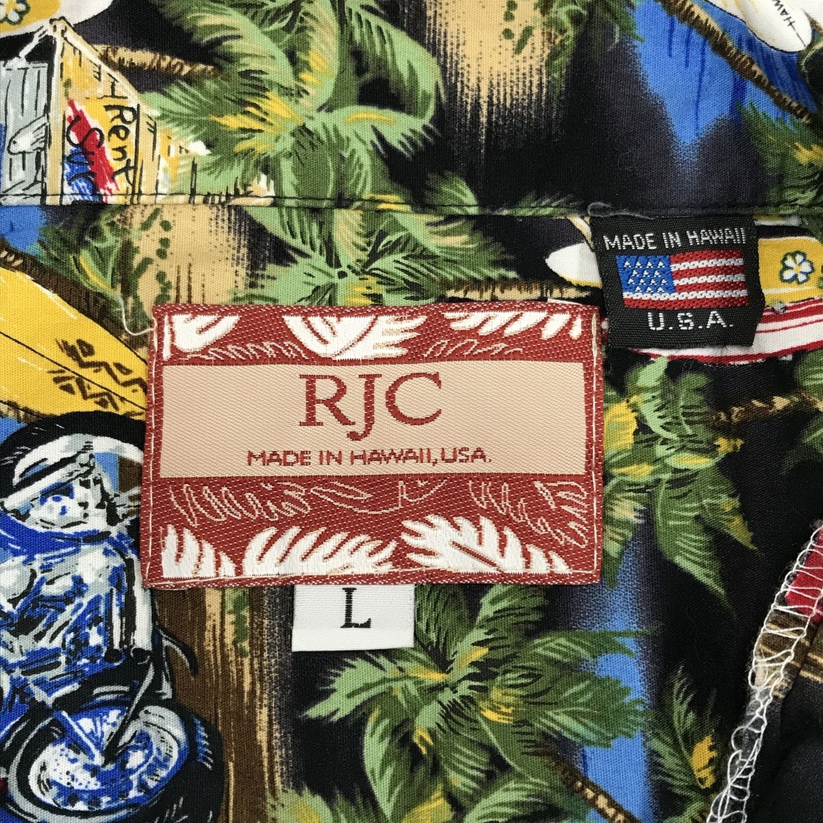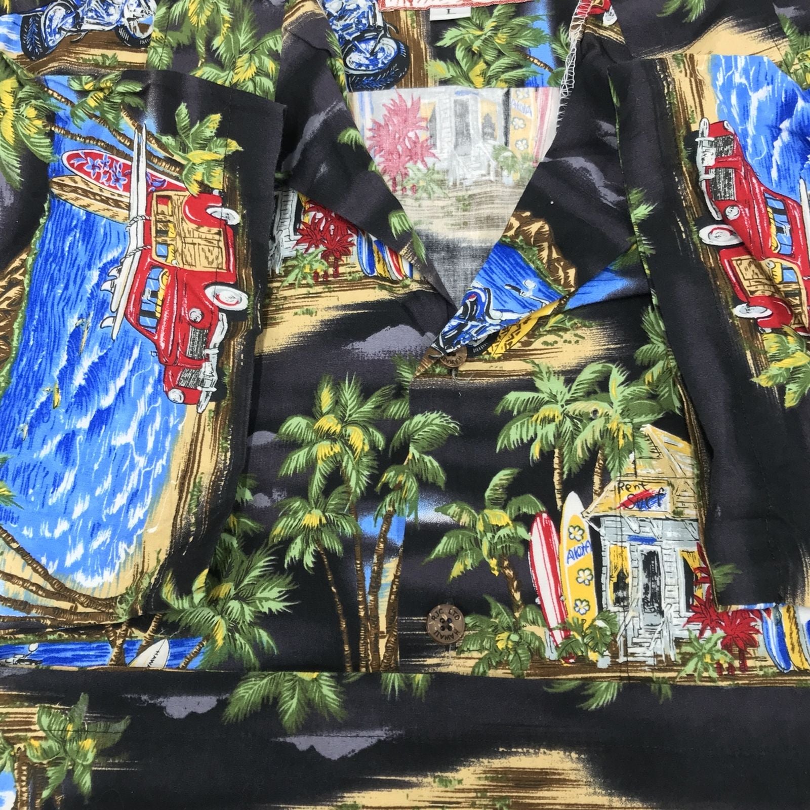 【中古】RJC | アールジェイシー 半袖シャツ 80~90年代 RJC アロハ ハワイアンシャツ ブラック オートバイ柄 ブラック サイズ:L【加古川物流】