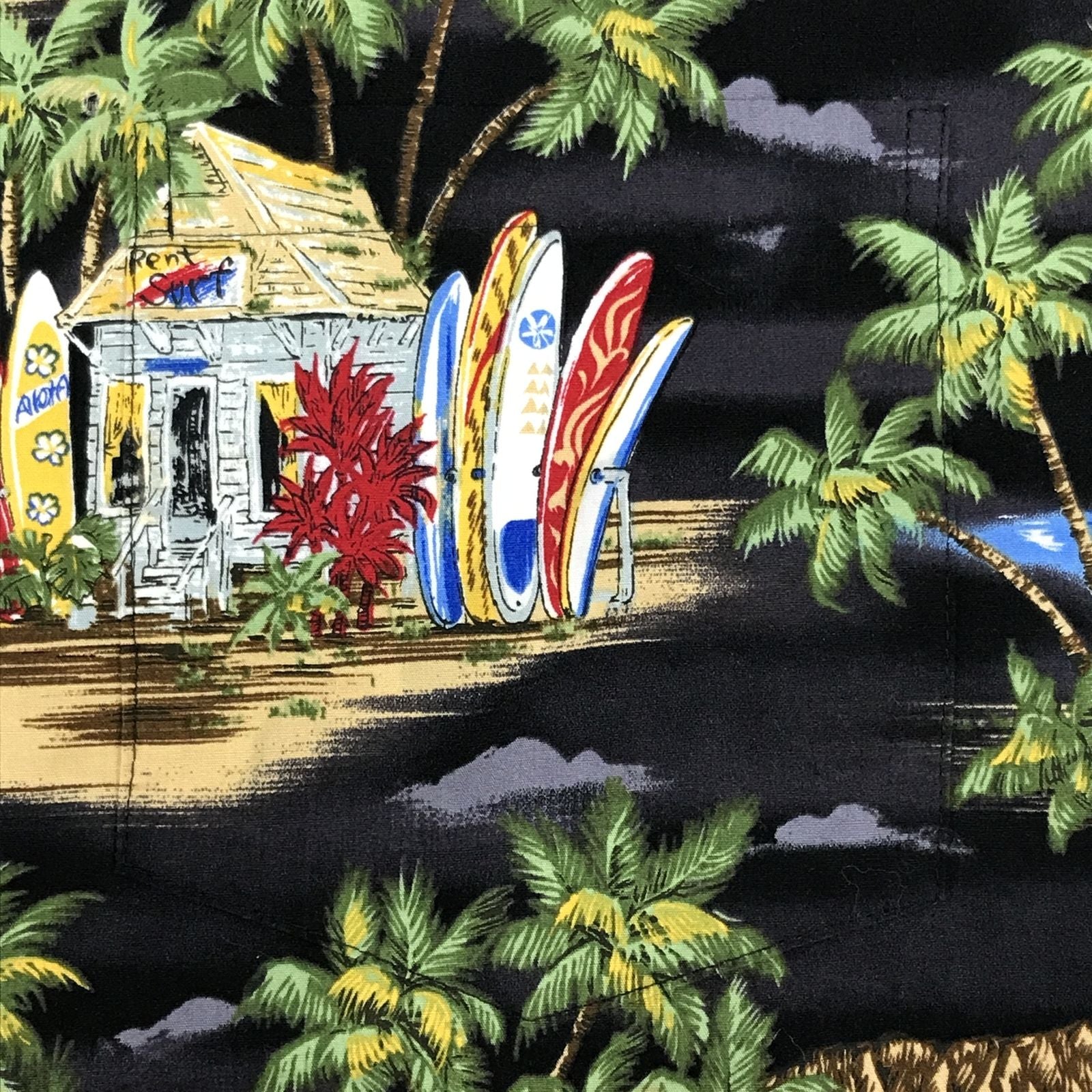 着丈:約 77cm 肩幅:約 48cm 身幅:約 60cm 袖丈:約 25cm コットン系アロハシャツです 波打ち際のバイクとサーフボード・・ポケット柄合わせです |